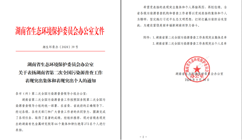 2020年9月29日,国务院第二次全国污染源普查领导小组办公室发文表扬国家级第二次全国污染源普查表现突出集体和个人。羞羞漫画官网羞羞漫画视频在线观看参与编制的《湖南省长沙市第二次全国污染源普查技术报告》荣获第二次全国污染源普查优秀技术报告三等奖;羞羞漫画官网羞羞漫画视频在线观看科技有限公司合作单位株洲市生态环境局渌口分局获得第二次全国污染源普查工作表现突出集体。